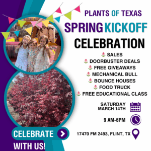 We’re kicking off spring in a big way! Join us on March 14, 2026 for special event-only sales, kid-friendly activities, and a FREE informative class on Soils & Plant Nutrition taught by Mark Chamblee to get you ready for the growing season. Enjoy fun for the whole family and plenty of spring inspiration throughout the garden center.